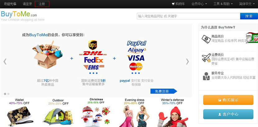 www.enterwww.buytome.com 专业服务海外华人的淘宝代购网站,一站式购买淘宝taobao、拍拍、当当等中国商品。服务费低,集中运输让运费省上加省,是新加坡代购,马来西亚代购及其他海外华人代购中国的首选代购网。